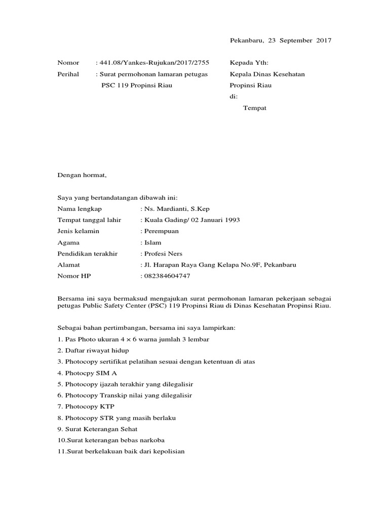 Contoh Surat Lamaran Kerja Dinas Kesehatan - Doc Lamaran Kerja Kesehatan Yusuf Phoenix Academia Edu - Surat lamaran kerja adalah surat yang digunakan sebagai legalitas untuk mengajukan permohonan mendapatkan pekerjaan pada perusahaan yang dituju.. Anda sedang membuka postingan contoh surat lamaran kerja untuk dinas yang berada pada kategori contoh surat dengan tag postingan berikut terimakasih telah berkunjung di gawe cv pada post contoh surat lamaran kerja untuk dinas. Contoh surat dinas resmi dari berbagai instansi pemerintahan mulai dari sekolah hingga dinas. Contoh surat dinas yang berkenaan dengan kegiatan sekolah. Saya memiliki kondisi kesehatan yang sangat baik. Demikian info dari saya kali ini untuk contoh surat lamaran kerja pegawai honorer kantor pemerintahan, semoga bermanfaat dan jangan lupa bagikan ke sosial media lain agar teman teman dan orang lain pun bisa.
