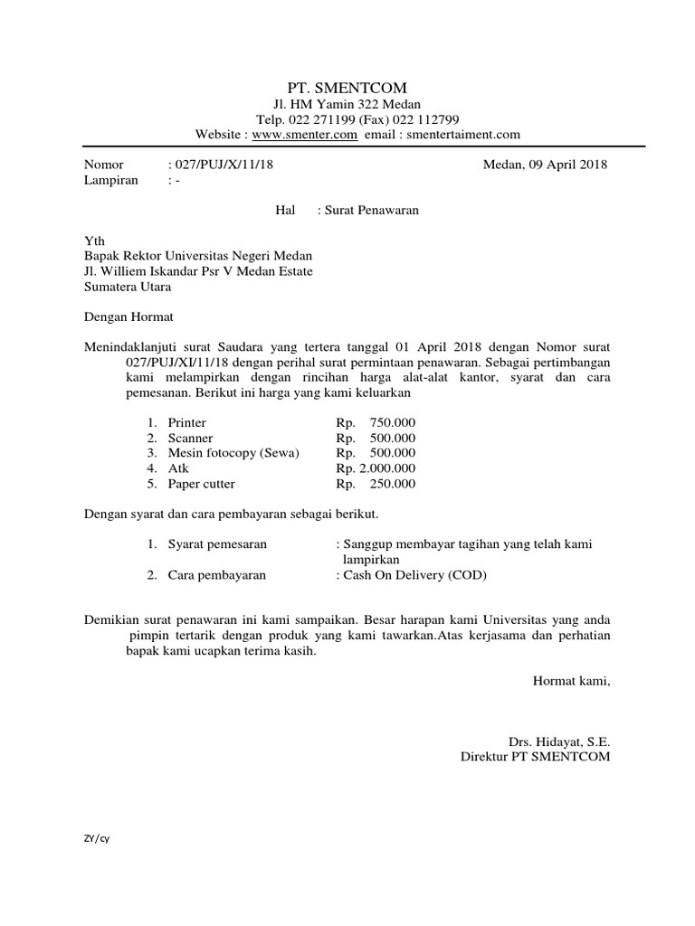 Contoh surat penawaran dan permintaan. 9 contoh surat penawaran untuk mempromosikan produk jasa anda. Surat ini berisi mengenai permintaan pembelian barang tertentu kepada penjual, baik itu perusahaan maupun perseorangan. Jenis surat pun ada bermacam macam. Salah satu jenis atau bentuk surat resmi yang paling sering digunakan adalah model atau bentuk semi block style. Dimulai dari surat penawaran produk permintaan penawaran produk. Surat semi block style maupun full block style sering digunakan untuk surat menyurat di kantor kantor perusahaan seperti surat penawaran , surat permintaan barang dan lainnya. Surat permintaan penawaran pada dasarnya digunakan oleh perusahaan untuk menanggapi atau melakukan permintaan terhadap penawaran yang sebelumnya dilakukan oleh perusahan yang melakukan penawaran tersebut. Kumpulan surat niaga penawaran, pemesanan, dan permintaan (rekomendasi). Secara umum, surat penawaran harus singkat. Untuk lebih jelasnya anda bisa melihat contoh surat permintaan penawaran semi block style di bawah ini. Gaya penulisan surat semi block style bisa digunakan untuk berbagai keperluan baik pribadi maupun perusahaan. Dalam surat menyurat niaga, terdapat surat permintaan penawaran, surat penawaran, surat pesanan atau pun surat pengaduan.